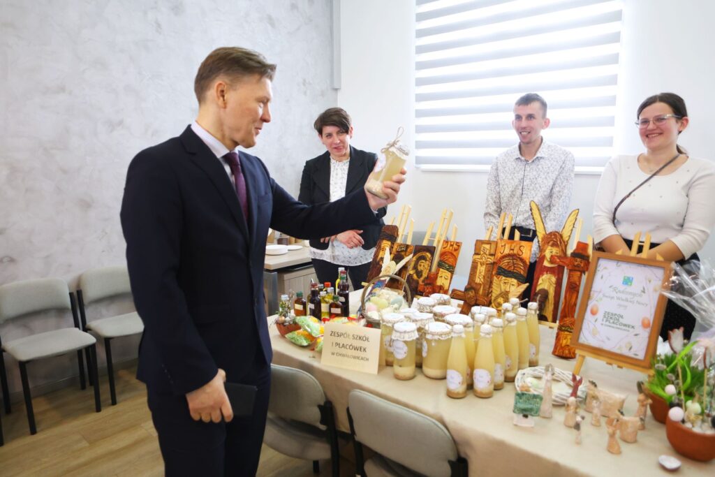 Piękne koszyczki, palemki, pisanki, zajączki i wiele innych. Wszystko to można było zakupić w czwartek w siedzibie Starostwa Powiatowego w Radomiu. Już po raz kolejny zorganizowany został Kiermasz Wielkanocny, w którym mieszkańcy domów pomocy społecznej, warsztatów terapii zajęciowej, podopieczni naszych placówek – mogli sprzedawać zrobione przez siebie świąteczne produkty. Trzeba przyznać, że na stołach zrobiło się wiosennie, uroczo i kolorowo. Zakupy zrobili pracownicy starostwa, ale też osoby, które akurat przyjechały do urzędu.